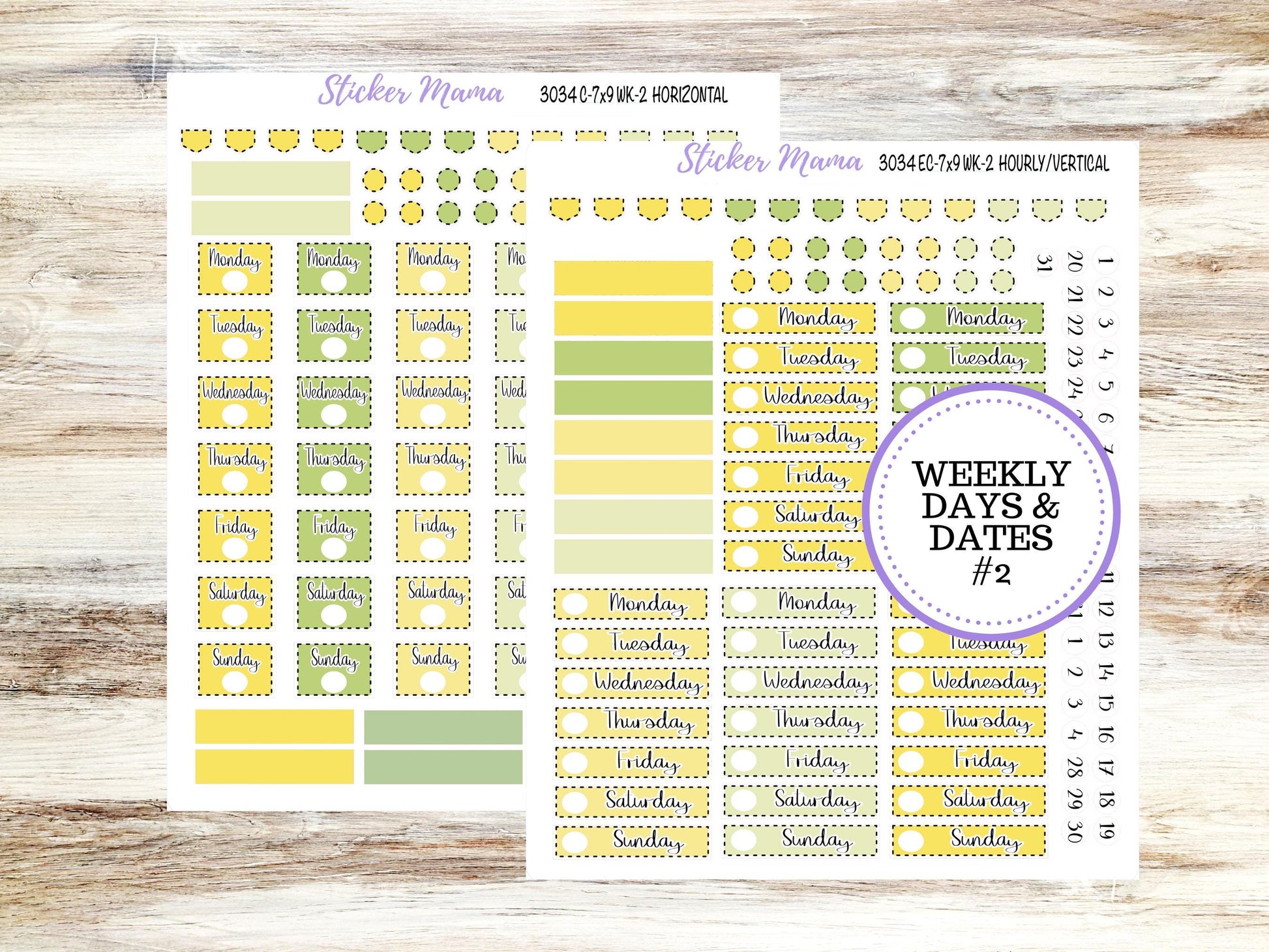 WK2 (Hourly/Vertical): Days of the week and dates for hourly and vertical planners