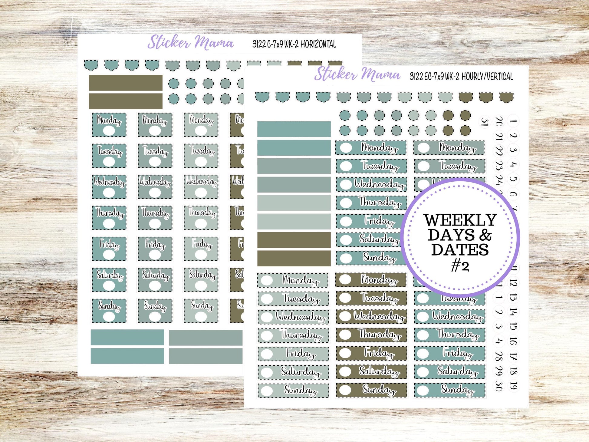WK2 (Hourly/Vertical): Days of the week and dates for hourly and vertical planners