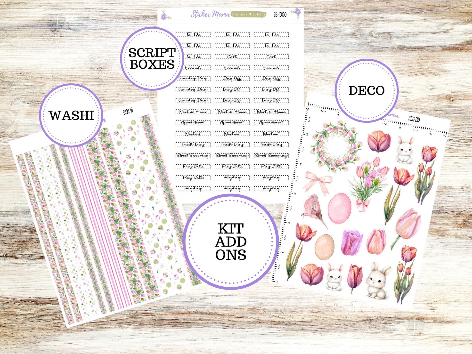 Sheet 2: Variety of stickers, washi strips .25" wide, planner words, deco, cute planner icons, weekly tracker
