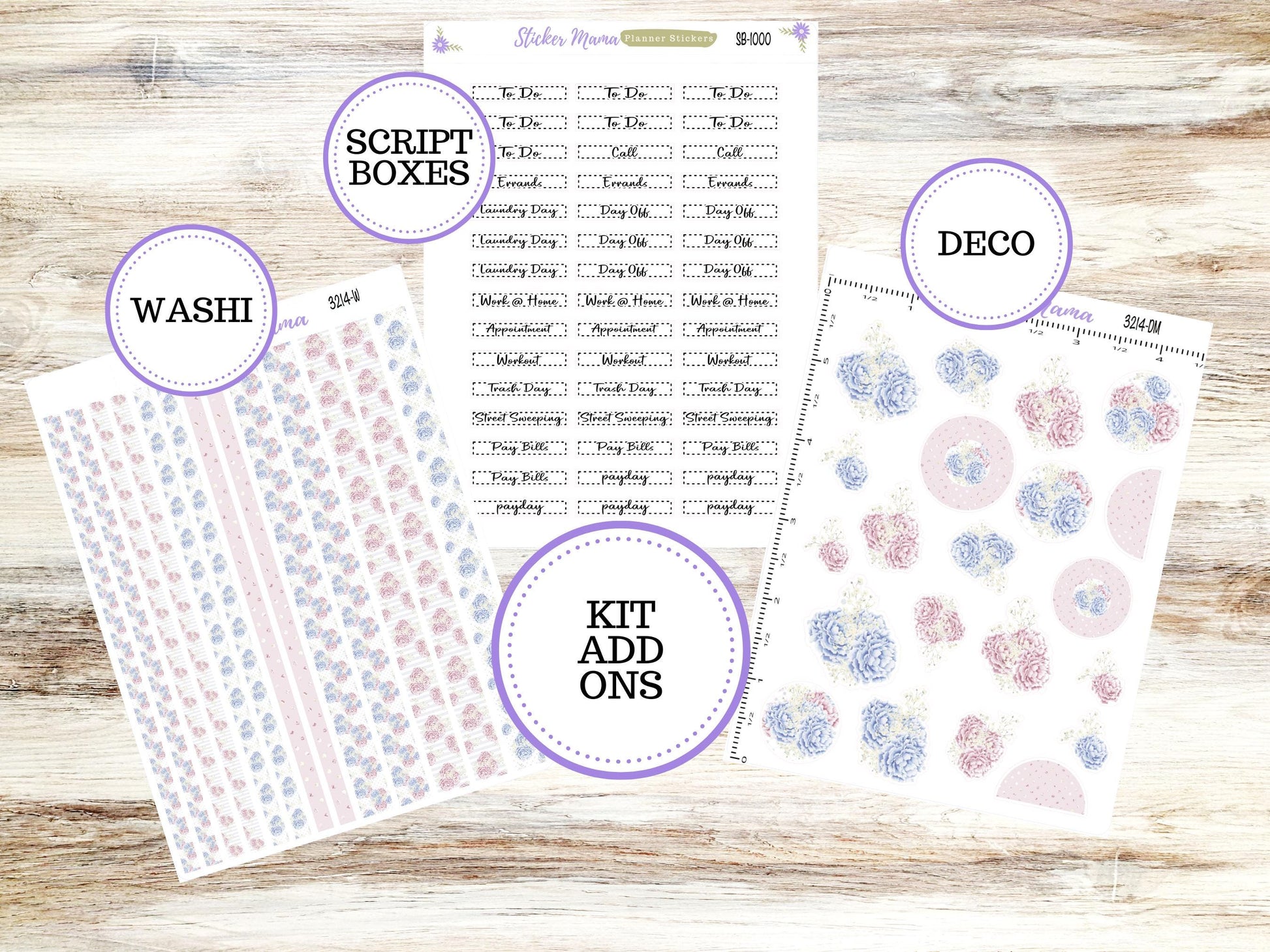 Sheet 2: Variety of stickers, washi strips .25" wide, planner words, deco, cute planner icons, weekly tracker
